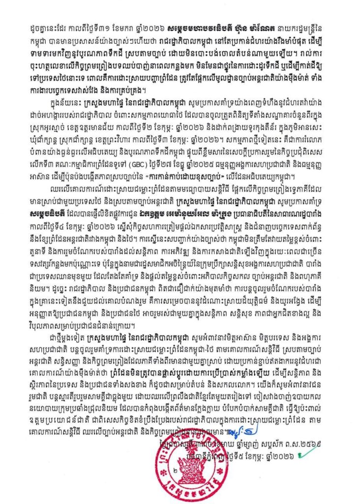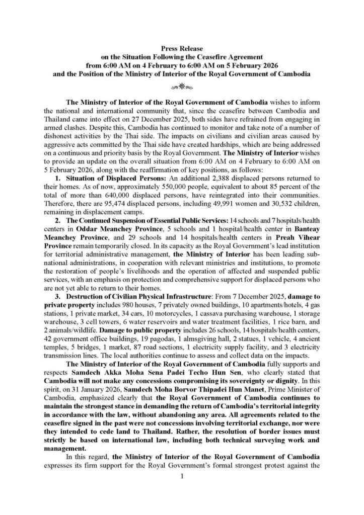 (ភ្នំពេញ)៖ ក្រសួងមហាផ្ទៃ នៅព្រឹកថ្ងៃទី៥ ខែកុម្ភៈ ឆ្នាំ២០២៦នេះ បានឲ្យដឹងថា គិតចាប់ពីម៉ោង៦ព្រឹក ថ្ងៃទី៤ ខែមករា ដល់ម៉ោង៦ព្រឹក ថ្ងៃទី៥ ខែកុម្ភៈ ឆ្នាំ២០២៦នេះ មានពលរដ្ឋភៀសសឹក២,៣៨៨នាក់បន្ថែមទៀត បានបន្តវិលត្រឡប់ទៅលំនៅឋានវិញ ដូច្នេះក្នុងចំណោមពលរដ្ឋភៀសសឹកសរុបជាង៦សែន៤ម៉ឺននាក់ មានប្រមាណ៥សែន៥ម៉ឺននាក់ បានវិលត្រឡប់ទៅលំនៅឋានវិញ។ ពលរដ្ឋភៀសសឹកបន្តស្នាក់នៅជំរំមានចំនួន៩៥,៤៧៤នាក់ ក្នុងនោះស្រ្តីមាន៤៩,៩៩១នាក់ និងកុមារ៣០,៥៣២នាក់។ ការភៀសសឹកទ្រង់ទ្រាយធំបែបនេះ បានធ្វើឲ្យប៉ះពាល់យ៉ាងធ្ងន់ធ្ងរ ទាំងផ្នែកមុខរបរ សុខុមាលភាព សាធារណៈ សិទ្ធិលំនៅឋាន ជាពិសេសសិទ្ធិទទួលបានការសិក្សារបស់កុមារ និងប៉ះទង្គិចផ្លូវចិត្តដ៏គួរឲ្យព្រួយបារម្ភ។ ជាងនេះទៅទៀត ពលរដ្ឋភៀសសឹកខ្លះ វិលដល់ភូមិករមែន ប៉ុន្តែត្រូវបង្ខំចិត្តស្នាក់នៅក្នុងជំរុំបណ្ដោះអាសន្នជាថ្មីទៀត ដោយសារផ្ទះសំបែងបានខូចខាតខ្ទេចរាបដល់ដី និងពោរពេញដោយសំណល់យុទ្ធភណ្ឌមិនទាន់ផ្ទុះរបស់យោធាថៃ។ ខាងក្រោមនេះ ជាសេចក្ដីប្រកាសព័ត៌មានរបស់ក្រសួងមហាផ្ទៃ៖