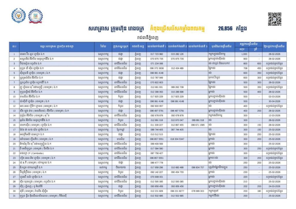 ក្រសួងការងារ៖ រាជធានីភ្នំពេញ មានឱកាសការងារជាង ២ម៉ឺនកន្លែង កំពុងរង់ចាំអតីតពលករត្រឡប់មកពីថៃ និងអ្នកកំពុងស្វែងរកការងារធ្វើ