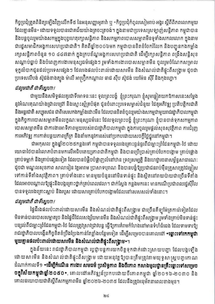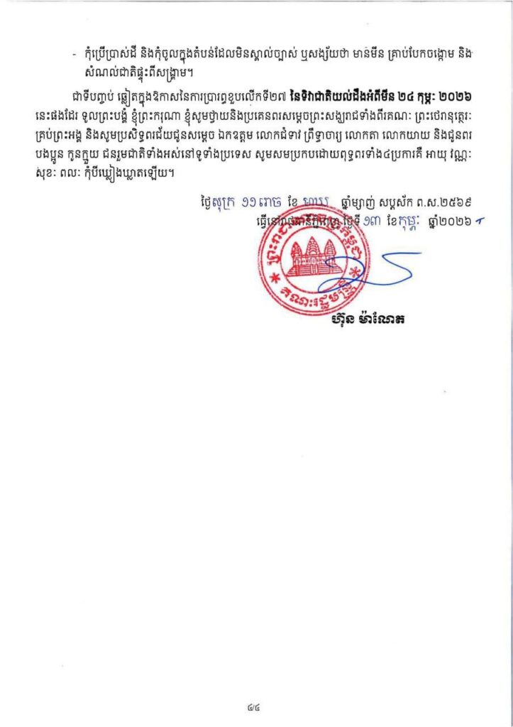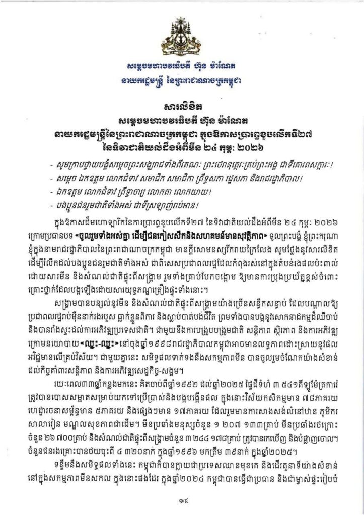 (ភ្នំពេញ)៖ សម្តេចមហាបវរធិបតី ហ៊ុន ម៉ាណែត នាយករដ្ឋមន្ត្រីនៃកម្ពុជា បានចេញសារលិខិតក្នុងឱកាសប្រារព្ធខួបលើកទី២៧ នៃទិវាជាតិយល់ដឹងអំពីមីន (២៤ កុម្ភៈ ២០២៦) ក្រោមប្រធានបទ «ចូលរួមទាំងអស់គ្នា ដើម្បីជនភៀសសឹក និងសហគមន៍មានសុវត្ថិភាព»ខាងក្រោមនេះជាសារលិខិតរបស់សម្តេចបវរធិបតី ហ៊ុន ម៉ាណែត៖